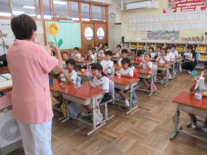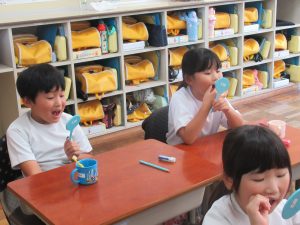 紙芝居を読んでもらい、歯には「前歯」「犬歯」「奥歯」があり、「前歯」は噛み切る、「犬歯」は引き裂く、「奥歯」はすりつぶす役割があることを知りました。自分の歯を手鏡で観察し、歯の形を確認しました。また、歯ブラシの毛先の使い方や歯ブラシの交換ポイントも教えてもらいました。「毛先を歯と歯肉の境にしっかり当てる」、「歯ブラシを細かく動かす」、「軽い力で磨く」など教えてもらったポイントを意識してこれからもきれいな歯を目指していけるといいなと思います。