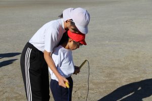 「前とびは、わきをキュッとしめるととびやすいよ!」「こうやってやるんだよ!」「お手本をやるから見ててね!」と、優しく分かりやすく教える姿がとてもほほえましく、6年生の成長を感じることができました。