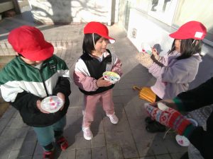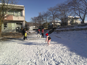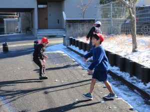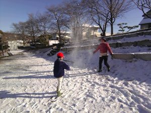 雪合戦を楽しむ子、枝に積もった雪を落としてキラキラ光る雪を楽しむ子。